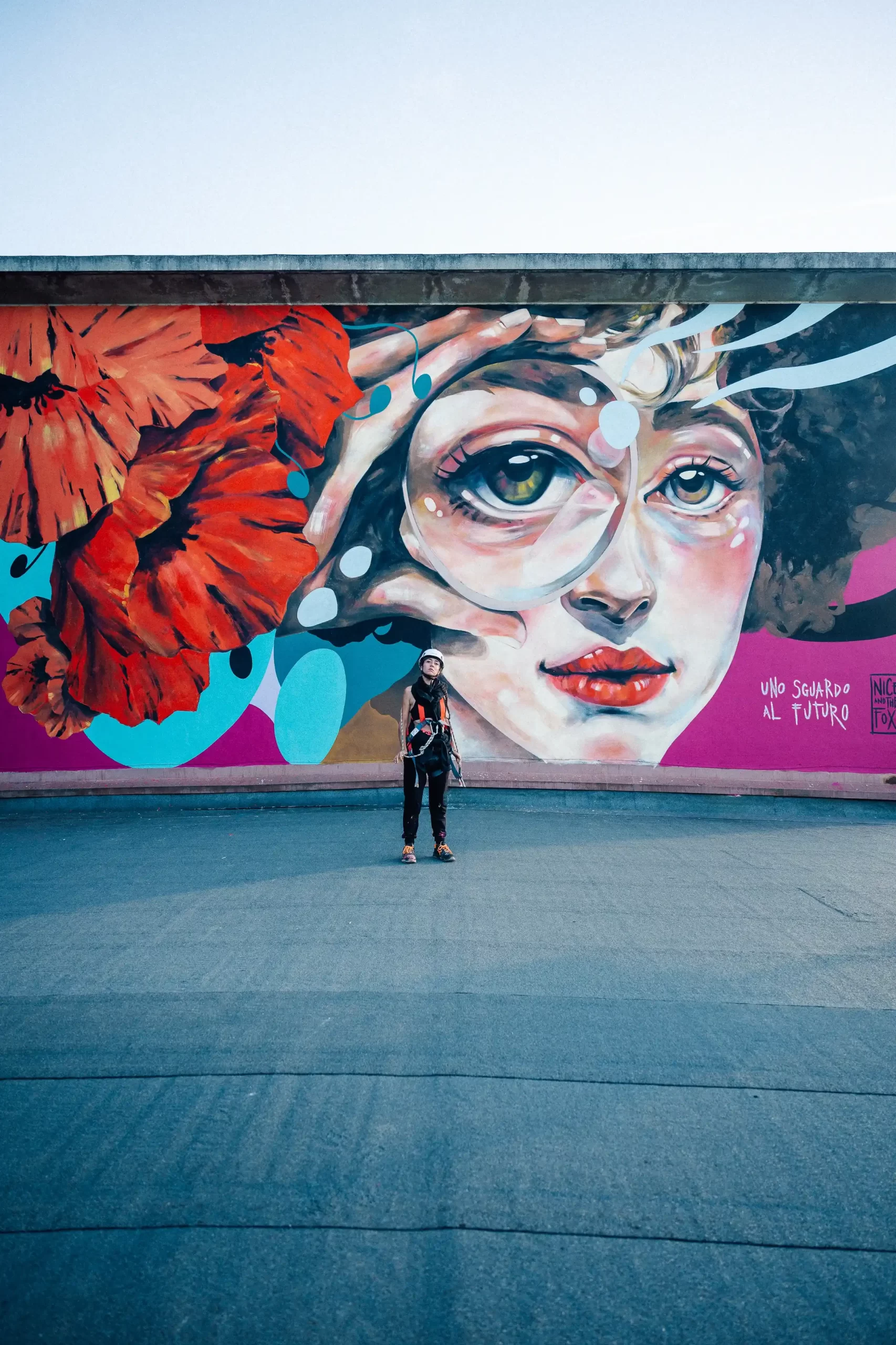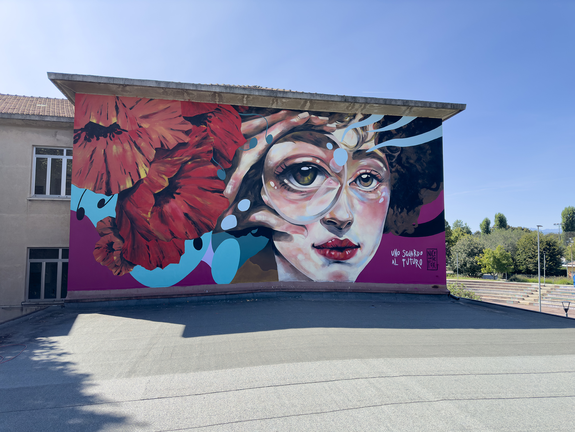 “Uno Sguardo al Futuro” è un progetto di arte urbana partecipata, sponsorizzato da Salmoiraghi & Viganò, che vuole mettere al centro le nuove generazioni, dando voce al loro punto di vista e a una visione di futuro che permetta una vita più sostenibile dal punto di vista ambientale e di solidarietà sociale. Dalla collaborazione tra l'Agenzia Brand for the City, il Liceo Artistico Statale Renato Cottini, il progetto MurArte della Città di Torino e le associazioni Il Cerchio e le Gocce e Monkeys Evolution si è sviluppato un percorso che da un lato ha visto l'individuazione dell'artista Nice and the Fox per la realizzazione sulla facciata del Liceo, dall'altro ha coinvolto 20 studenti in un laboratorio di arte urbana, insegnando loro non solo tecniche artistiche ma, soprattutto, il valore della collaborazione e dell’impegno collettivo. Francesca Nigra ha voluto rappresentare lo sguardo, quello che osserva il mondo e lo immagina migliore. È un invito a prendersi cura di ciò che ci circonda, a non voltare lo sguardo altrove.
